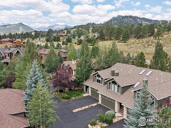 Come check out this great condo with transferable STR license sold turnkey! 3 bed/3 bath open concept living. Upper level has master bedroom, living area & kitchen decked out with stone counters & beautiful cabinets. Lower level has 2 bedrooms, full bath, family room, laundry & 2 car garage. Central A/C and sound proof windows round out the amenities. Close to town, walk to restaurants & recreation. Less than 2 miles to RMNP south entrance. STR managed by Sky Run. Water included in HOA dues