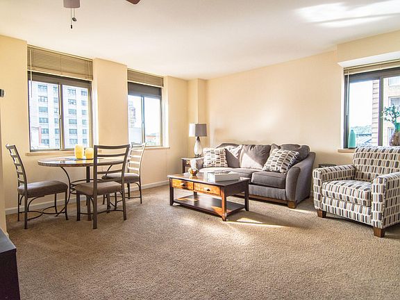 Small floor plan (Apt. AMENITIES * Door Man * On-site Property Management * Secure, keyed entry * Community Room w/ kitchenette, pool table, wifi, cable, and plenty of lounge space * Laundry on-site * Garbage chutes on each floor * FREE bicycle storage * Extra storage on each floor (inquire for pricing) * Wall-to-wall carpet * Air Conditioning * Reduced monthly rates at nearby parking garages Security Deposit equal to one month rent Application fee: $40 Sorry no pets Equal Housing Opportunity 12 months, all utilities included