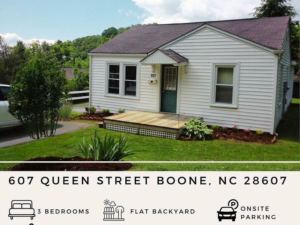 Prime Downtown Boone Location! Experience the best of Boone living in this charming 3-bedroom, 2-bathroom ranch home! Ideally located within walking distance to Appalachian State University and King Street, this home offers both convenience and comfort. The spacious layout features an eat-in kitchen, a cozy living room, and a flat yard perfect for outdoor relaxation or entertaining. With on-site parking and a prime location, this home is a rare find in the heart of Boone! Lease Details: Jointly leased with a security deposit typically equal to one month's rent. $200 administrative fee due at lease signing. Tenant responsible for all utilities (weekly trash pickup included). Electric baseboard heating, no AC. No pets allowed. No fraternity or sorority members permitted. Application Process: For more information on leasing please email: 607QueenStreet@gmail A non-refundable application fee per applicant (18+) is required for a background check. Owner is licensed real estate agent. A $200 administrative fee is required at the time of lease signing. Tenants are responsible for all utilities, except for weekly trash pickup, which is included. The property is heated by electric baseboard and does not have air conditioning. Pets are not permitted. To process your application, we require the first and last name, email address, and phone number of each applicant. A one-time, non-refundable application fee of $applies to each applicant over 18 years old to cover the cost of a background check.