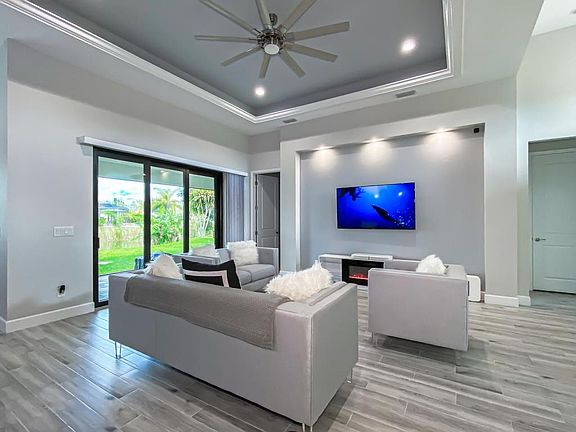 You are going to love this spacious modern/contemporary home! Located in a desirable SW Cape Coral neighborhood, NO Flood Zone on a freshwater canal to enjoy plenty of fishing on those beautiful Florida evenings. Featuring over 1800 sq. ft. of living area, double door entry, Tray ceilings, Paver driveway, walkways and lanai. You will be welcomed by the grand entry way with travertine natural stone columns it grabs your attention at very start. This floor plan showcases 4 bedrooms, 2 baths, with a spacious living room for those family get-togethers. Open concept with dream kitchen that comes with a touch of glass! Glass Mosaic subway backsplash, stainless steel appliances, wine fridge and top level granite countertops, torn right from the a pages of a magazine. The master bedroom and bath include a spacious shower with glass mosaic waterfalls separate vanities with comfort in mind; making this is instant show stopper. However we didn't forget the guest bath either with the same attention to detail given throughout the entire home. Not to mention with your 3 car garage and extended length for full size vehicles and left with plenty of storage space as well. Welcome Home!