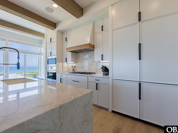At the heart of the home is a chef’s dream kitchen, featuring a Wolf gas cooktop, Sub-Zero refrigerator, and stunning quartzite countertops. The open dining area offers panoramic ocean views, perfect for hosting unforgettable gatherings. En-suite bedrooms with custom walk-in closets provide a luxurious retreat, while a full-sized laundry room ensures convenience. Designed for both relaxation and functionality, the first floor boasts a poolside bar, Sub-Zero fridge, Hoshizaki ice machine, and lounge area with direct access to the heated pool, hot tub, and ocean-facing deck.
