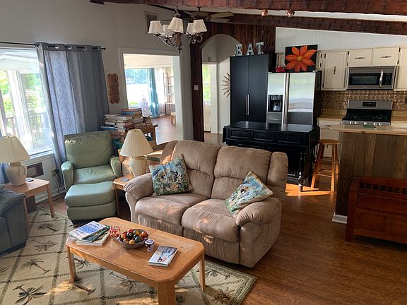 Talk about a water view. If this property didn't have a house on it, you would want to buy the land and just camp out in a tent. Words can't describe the amount of water that you see outside this home. It has a large living and kitchen area with fireplace overlooking the lake. It has a big dining room and sunroom overlooking the lake. It has three bedrooms with one overlooking the Lake. It has a big deck up and also down overlooking the lake. It has a wonderful yard with picnic tables next to the lake. It has a great boathouse with pontoon boat right on the lake. Just a few words to describe this listing, so if you are looking for water, bring your check book.