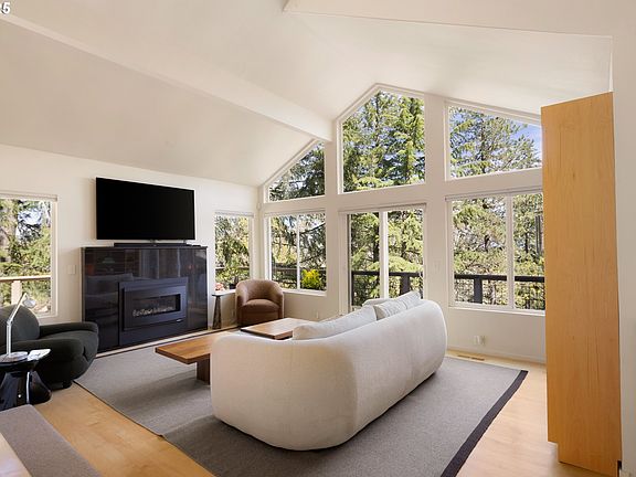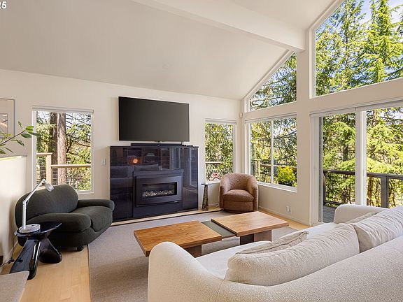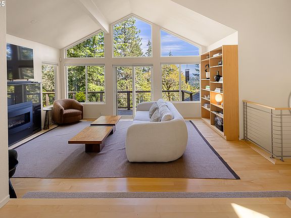 Sleek, sexy, and stylish describes the vibe in this gorgeous contemporary with jaw dropping appeal from the moment of entry. The fully updated interior is light-filled and airy with vaulted living space and impressive window display showcasing tree top and mountain views. Maple hardwood floors, doors, and cabinetry were the perfect choice for timeless appeal and contemporary style. The beautiful and well-appointed kitchen with dedicated bar area flows into the dining space, giving the perfect entertaining layout. Bedrooms are tucked away a few steps up from the living space, giving thoughtful separation. Enjoy the comfortable primary suite with its own private view deck, walk-in closet, separate built-in storage, stylized bathroom with glass and tile walk-in shower and double vanity. A lower area family room with gas fireplace, deck, and full bathroom are a great addition and allow flexibility of use whether for lounging, guests, or work space. Additional upgrades include custom cable railings, central vacuum system, solar tubes in many rooms, security system, and custom built-ins. The attached two car garage and extra driveway space provide ample parking and storage. Situated on a low maintenance corner lot in the south hills near Spencer Butte and trails and easy distance to schools and shopping in the Willamette corridor. This one has all the WOW factor!