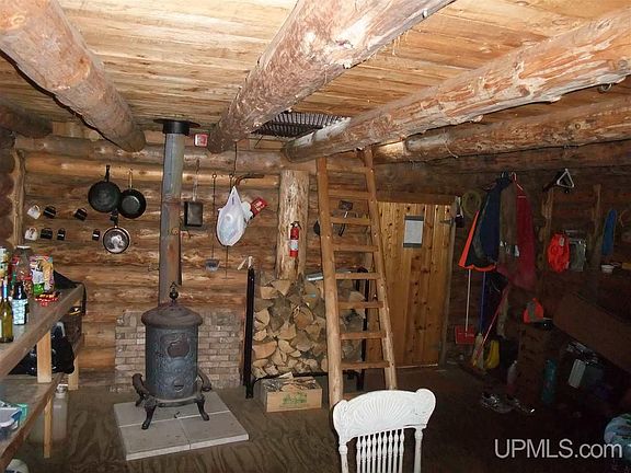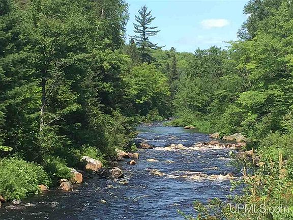Rustic Log Cabin right on the Peshekee River! This is an off the grid, wilderness base camp with 20 acres. It is on a paved County road that is plowed for year round access. This location offers rugged terrain with high bluffs, dense forests, loads of inland lakes for excellent fishing. Lots of deer, bear and grouse, ATV and snowmobile trails. The cabin is an open room with a second story bedroom/loft. There is a balcony off the bedroom overlooking the river, wood stove for heat, sauna and storage building, outhouse and a wood fired river water hot tub.