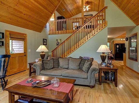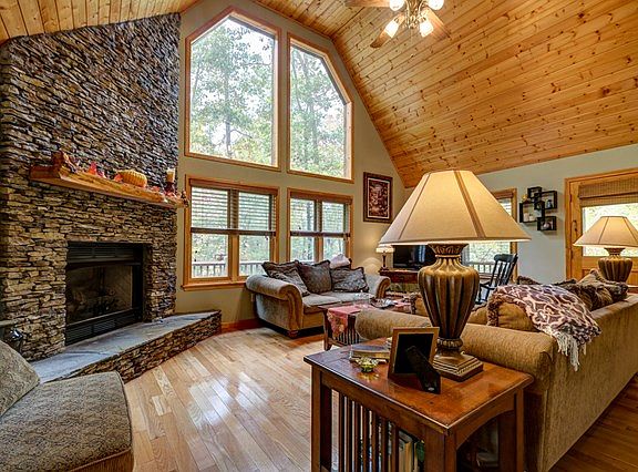 Sunshine filters through hardwood trees to your welcoming mountain home! Spend your day in your outdoor sanctuary then relax in Adirondack chairs around the fire pit, watch birds at the stone birdbath, or just soak up the quiet. Natural light filters through tall windows by day, starlight by night, as you snuggle by the magnificent living room fireplace. Feed a crowd from a spacious kitchen with ebony appliances, recessed lighting, double stainless steel sink, and eat-in space. Loft master suite with arched wood ceiling. Main level bedroom plus the semi-finished lower level offers another bedroom with attached sitting room or office, plumbed for additional bathroom near laundry. Magnificent!