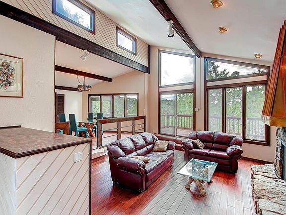 Pikes Peak from every room from the secluded home in the center of town. Nestled on a quiet culdesac and surrounded by Ponderosa Pines yet plenty of space to see the HooDoo Rock formations while looking straight on to unobstructed views of Pikes Peak and the front range. Contemporary style home to relax in front of the stone clad wood fireplace with soaring windows and views galore. Massive master suite with its private deck and huge walk in closet highlights the views and vaulted ceilings. Large eat in kitchen with plenty of counter and cabinet space walks out to a stunning covered back deck.Great place to hike right in your back yard and feel like you are in the mountains. Massive walkout lower level with wet bar, two recreation rooms and huge bedrooms if perfect for entertaining and a crowd. Walk out to the amazing stone patio and enjoy privacy and views.