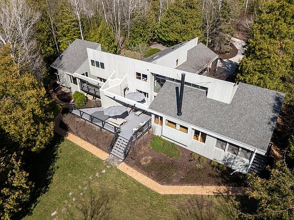 Unwind in style at this casually elegant contemporary home—a true retreat on quiet Lady Slipper Rd, offering rare privacy on over 2 acres with approx. 300 feet of Green Bay shoreline. A 2013 primary suite addition and interior remodel blend modern comfort with unique architectural charm. Whimsical angles, walls of windows, & water views from nearly every room create a light, inviting atmosphere. The expansive first-floor primary suite feels like a private sanctuary w/ its spa-like bath, while 3 additional bedrooms & a loft offer space for guests and a home office. Enjoy the spacious deck with hot tub and outdoor shower, dine in the screened porch, or launch a kayak from the walk-out stone beach. End each day with an iconic Door Co. sunset.