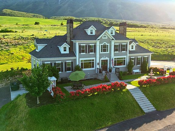 Experience luxury living in this stunning colonial-style mansion nestled in the foothills of Mendon, Utah. Every room captures panoramic views of the valley and the towering Wellsville Mountain Range.Set on over 5 acres, this estate offers access to mountain trails, a tree-lined entrance, a leveled pad for a barn or shop, and a courtyard with vibrant roses. Inside, exquisite details include 8' solid core doors, oil-based hardwood floors, interior firewood room and over 7,800 sq ft of refined living space with multiple HVAC zones for efficiency. Enjoy breathtaking views from the family room's floor-to-ceiling windows or relax in the main level master suite. The gourmet chef's kitchen features dual ovens, dual dishwashers, a commercial-sized refrigerator/freezer, and a spacious pantry. Host dinner parties in the exquisite dining room framed by valley views and warmed by one of three stately fireplaces. The second-floor conservatory offers a serene space for music or reading, while the third-floor entertainment room is perfect for games and movies. The basement includes plans for two separate apartments with private entrances, ideal for guest accommodations. Movie nights come to life in the designer home theater room, complete with a snack bar. Interior furnishings and professional decor are available for purchase. Request a full list from the listing agent, along with additional property features. Move-in ready and available for private showings with 24-hour notice. No showings before noon. Buyer to verify all information.