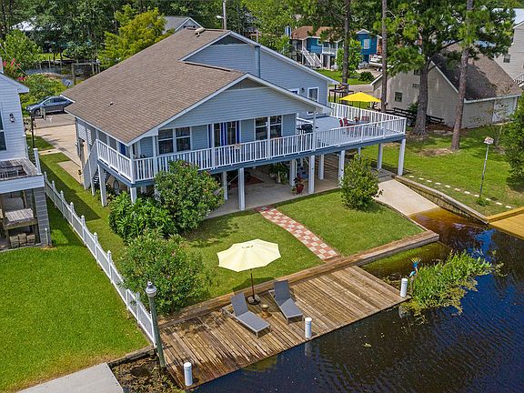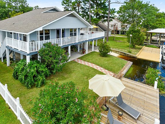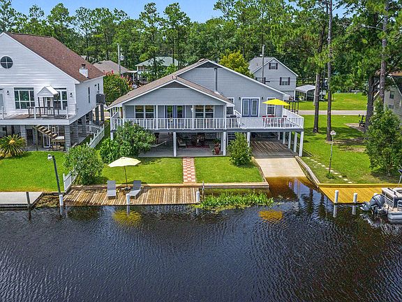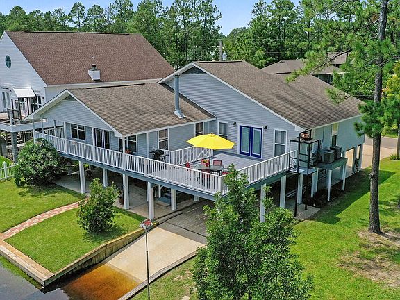 Great family home or camp on 100 feet of deep water in very popular Jourdan River Shores Subdivision, lots of windows with awesome water views, wonderful neighbors & located on a very high street that rarely goes under water. Two consolidated lots are bulk headed with two large nice piers, private boat launch, large sun deck & lots of outside entertainment areas. Two driveways with covered parking for cars & a boat, plus additional covered parking for golf cart, jet skis or small boat, cargo lift, two large storage rooms & bonus half bath. All new kitchen appliances & new washer & dryer, wood burning fireplace, split floor plan with very spacious master suite with deck access. House being sold furnished. It won't last long, come check it out!