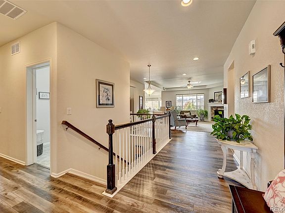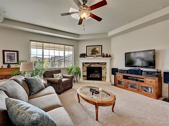 Welcome Home! You'll love this immaculate Richmond Delaney Ranch style home that has been meticulously maintained on a huge corner lot with Fantastic Views. Enjoy all of the upgrades this home has to offer. The Great Room boasts a built in fireplace gorgeous laminate flooring and is pre-wired for your home theater- wall speakers included. The Gourmet Chef's kitchen is an entertainers dream complete with gas cooktop, upgraded stainless steel appliances, massive island, granite countertops, and breakfast nook all over looking the beautiful landscaping in the backyard. The Primary Bedroom offers coffered ceilings, a full 5 piece en-suite bath with glass walk in shower and a massive walk in closet. Two more bedrooms on the main level and another full bath with upgraded counter top and double sink. In the basement you'll find a fantastic oversized flex space, entertainment area, additional bedroom with full bath and plenty of storage. Enjoy the outdoors in this beautiful space. The covered patio is perfect place to relax and enjoy nature. Lot's of trees, shrubs, flowers and that view. In addition to all this home has to offer you'll have access to all the wonderful amenities at the Pinnacle at Crystal Valley Ranch a state of the art recreation center with pool, fitness center, sports courts, dog park, sports fields and entertainment area with live music, movies and special events. Don't miss it!