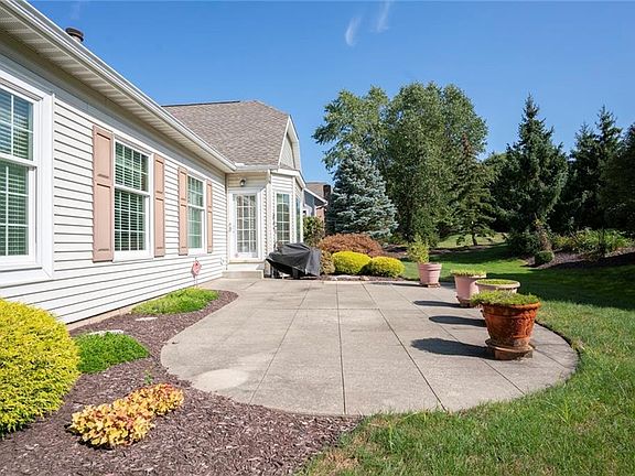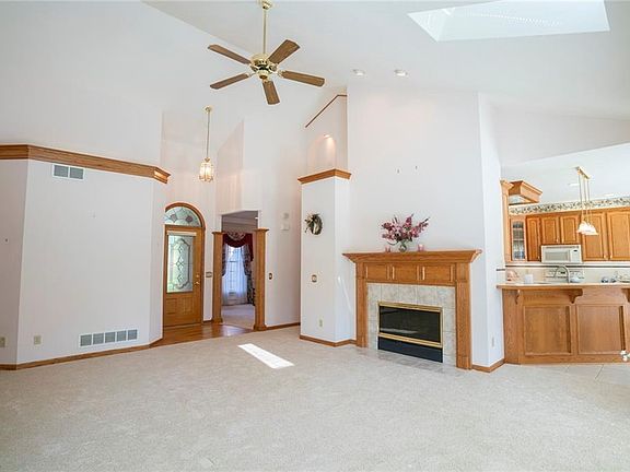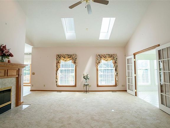Immaculate home with an open and flowing floor plan. Foyer opens to the vaulted great room, featuring skylights and gas fireplace. French doors lead to the bright and airy sun room, also with a skylight and 3 walls of glass. Spacious eat in kitchen with a 2 tier breakfast bar, lots of cabinet and counter space and fully applianced. The bayed dinette has a door conveniently located to exit to the nicely landscaped and private patio. The formal dining room, also bayed has a 9 1/2 trayed ceiling crown molding and wainscoting. Split bedroom design. Great master suite. Both jacuzzi and walk in shower, new double sink counter and huge walk in closet. Bedroom also features a 9 1/2 trayed ceiling and crown. Bedroom three could work well as an office, with built in cabinets, desk top and open shelving. The 13 course basement is plumbed for a full bathroom and has a second entrance from the garage. Excellent condition. New carpet-9/2021, Anderson windows-2015, AC-2017.