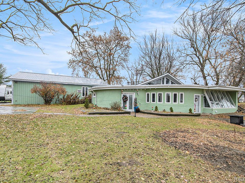 This contemporary ranch is perfectly located in heart of South Lyon on a huge lot that boasts phenomenal curb appeal and brand new driveway. Enter this naturally sunlit home through the spacious laundry/mud room and then step into the open floor plan. The unique kitchen features an abundance of cabinets, a wall of windows, newer appliances, and tile floors. The gorgeous living room is the epitome of comfort with built in bookshelves and an atrium. The ranch boasts a spacious primary bedroom, secondary bedroom and a bathroom. Enjoy your evenings on the slate patio sitting by a warm fire pit. There is a 2 car side entry garage/pole barn with an office space/gym and urinal. Recent updates include: new shingle roof, fresh exterior paint, air conditioning, furnace, tankless hot water, newer windows, new carpet, new concrete driveway, the list goes on. Move in just in time to enjoy all of the amenities and events South Lyon has to offer. Schedule your showing today!!