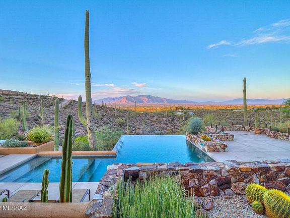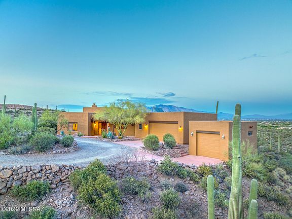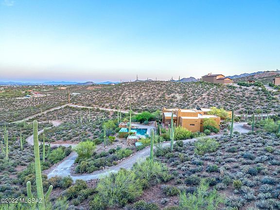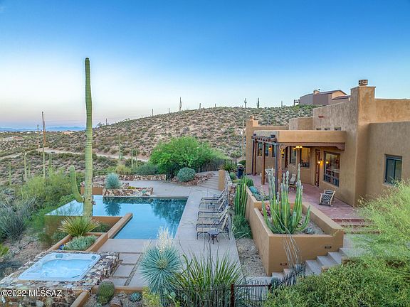 Is privacy your priority? Discover the world of peaceful living yet minutes from downtown Tucson. Amazing Santa Fe 3 bedroom, 2.5 bath home on private 5 acres abundant with local wildlife. Magnificent panoramic views of surrounding mountains and city views. Kitchen w/abundant cabinets, stainless steel appliances and breakfast bar. Kitchen opens to separate dining area and great room w/vaulted ceiling and wood beams. Split bedroom plan, primary bedroom w/wood burning fireplace, adjoining bath and wall in closet. Enjoy the outdoor areas including brick paver patio overlooking mountains, Tucson Valley, city lights, negative edge pool, bubbly heated in ground spa. Energy efficient solar hot water system. Call now to view this unique property and upgrade your lifestyle.