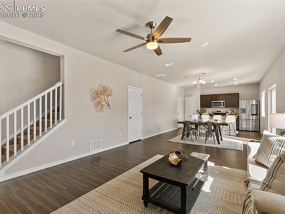 Presenting an exquisite residence within the esteemed Lorson Ranch neighborhood. This meticulously crafted, four-bedroom, three-bathroom home offers a seamless blend of sophisticated living and refined entertaining. The expansive, open-concept design is accentuated by gleaming granite countertops, flowing effortlessly from the chef-inspired kitchen into the elegant living spaces. Ascend to the upper level, where three serene bedrooms await, alongside a versatile loft and a thoughtfully integrated built-in desk, creating a private study. The main level presents a flexible suite, adaptable as a guest retreat, multi-generational living space, or executive office, complete with a private full bath. Step outside to the sprawling, extended stamped concrete patio, an idyllic setting for alfresco gatherings and refined outdoor living. Enhancements include a fully paid-off water softening system, ensuring pristine water quality, an electric vehicle charging station, and a distinguished stamped concrete walkway. This residence is presented in impeccable, move-in-ready condition. Its coveted location affords effortless access to Grand Mountain K-8 school, and is a short, convenient commute to Fort Carson, Peterson SFB, Schriever SFB, premier shopping, and fine dining. An unparalleled opportunity awaits. Schedule your private viewing today!