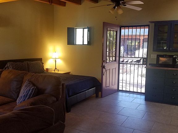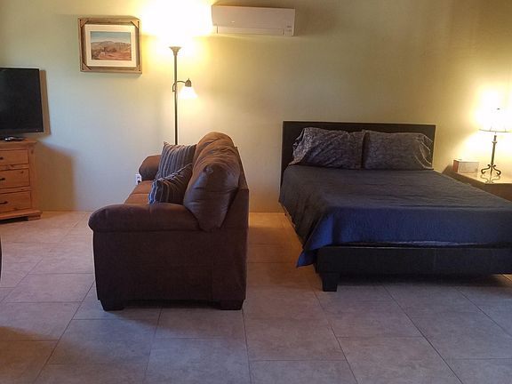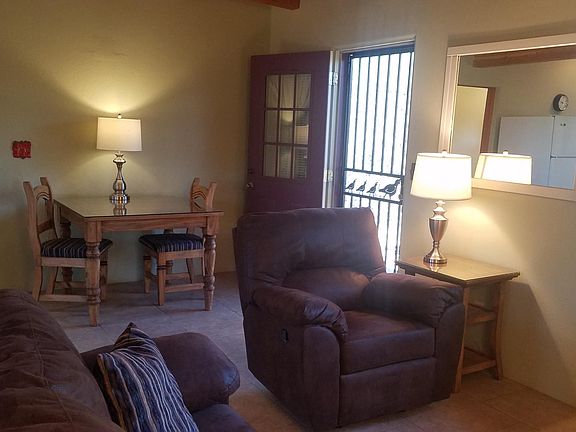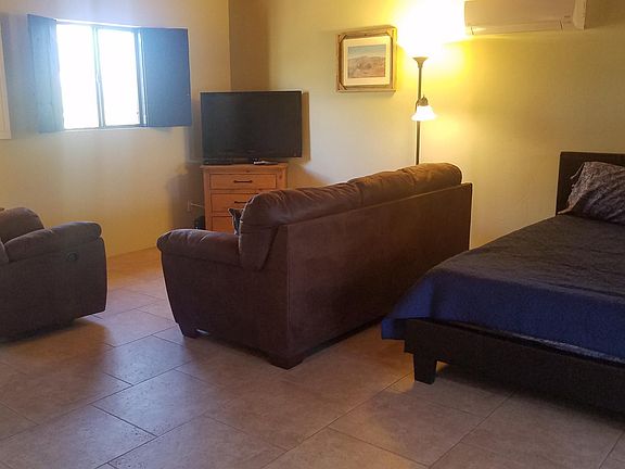 FURNISHED Studio type guest house located behind main home in quiet cul de sac off LaCanada between Orange Grove and River. Private parking off street on owners driveway. Completely furnished with NEW FURNITURE. Queen size bed, TV, washer/dryer, Jacuzzi Tub, walk in shower, large closets, vanity, etc. We have Wi-Fi, not cable. TV set up for streaming. Tenant provides own streaming services. Owner pays for everything else including soft water, heat/AC and trash. Well maintained adorable little home suitable for 1 person. Bed is located in living area. Shower/tub, vanity, closets and laundry area located in other room with door between. 800 sqaure feet of cuteness. Comfy couch and rocking recliner. No pets or smoking. First month rent and $400 security deposit required. Cheryl Hepner Owner pays for water, sewer, trash, AC, Heat, Wi-Fi