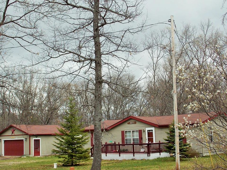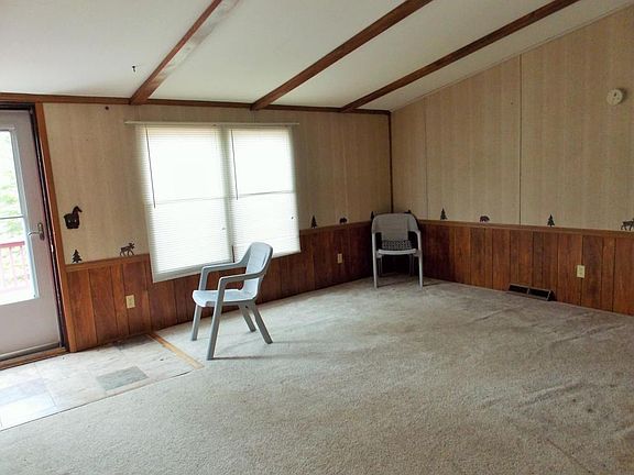 Cute HUD Sectional with deck on front and back. Two garages, 24' x 24' with cement floor, 20' x 25' with gravel floor, .6 acre of land, within walking distance to lake access. Two baths, three bedrooms, Hall 4.9'x34''; 6.4'x4.10' walk-in closet; 19.8 x 9.11 front deck; 8'x7.8 back deck. Add some paint and you are home. Great for vacation or year around living. Dues cover summer trash pick-up. Natural gas forced air heat. Near State land. Buyer or Buyers agent should re-check all measurements.