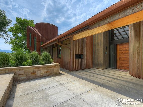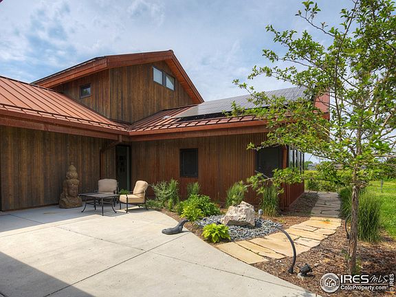 This magnificent architectural creation was completed in 2019 and is a true embodiment of environmentally conscious design. With the integration of extensive photovoltaics and geothermal heating and cooling systems, the residence boasts exceptional efficiency. Featuring a contemporary design and 'Courtyard House' layout, the home boasts five luxurious bedrooms, each with an ensuite bathroom. Nestled on five acres of land, surrounded by open space, with stunning, unobstructed foothill views, yet just a few minutes from Boulder, this home offers a tranquil retreat. The property also includes a spacious 2-car attached garage and an impressive array of outbuildings, including a 2100 square foot metal pole barn, plus 3 additional structures (totaling more than 2000 SF), dating back to the 1880's, offering ample space for a variety of hobbies and pursuits. The property also boasts water rights and has a myriad of towering old growth cottonwoods and fruit trees. This home presents a rare opportunity to own a piece of sustainable luxury, designed by Barrett Studios and meticulously constructed by Build Well.