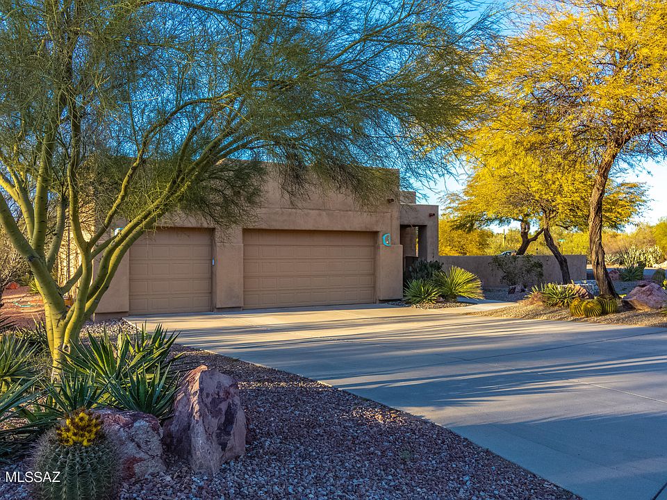 Beautiful SW contemporary in Casas Adobes area. Large lot on quiet cul-de-sac w/ gorgeous mountain views. Home includes 10' ceilings, colored concrete floors, oversized 3 car gar, space to park RV, no HOA! The yard includes 2 flagstone patios, unique stone wall features, turf space for pets, and big trees. Inside the home, find a fabulous kitchen with s/s appliances (includes range with double oven), granite counters, corner pantry, bkfst bar, and bkfst nook; 4 beds w/ one currently used as den; 2 baths w/ dual vanities and granite counters; jetted tub at hall bath; walk-in shower and closet at owners' bath. Also included are reverse osmosis, water softener, alarm system, window treatments, ceiling fans, newer windows and newer HVAC. Don't miss this meticulously maintained home!