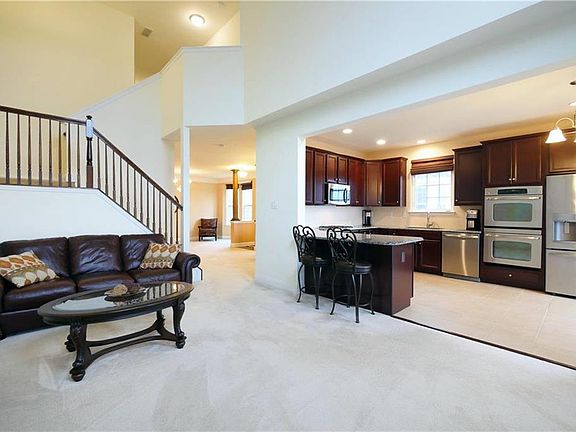 Panoramic views abound in this luxurious Foxton II end unit model in maintenance free Liberty Village in the highly-acclaimed Southern Lehigh SD! This model incudes a larger bumped out kitchen, basement and Master Ensuite. The gourmet, eat-in kitchen boasts upgraded granite counters, huge granite breakfast bar, Cherry Bordeaux cabinets, gourmet SS built-in cooktop and double wall ovens. Sliding glass doors open to a large Trex Deck. Open concept Great Room with soaring cathedral ceiling; open Formal LR with crown molding; open Formal DR with crown molding & wainscoting and a powder room complete the 1st floor. The large Master Ensuite includes a wall of windows w/window seat, 4 huge closets and upgraded tile surrounding the soaking tub and separate walk in shower. Two more large bedrooms and an upgraded guest bath and large laundry room complete the 2nd floor. Bumped out, walk-out Basement with sliding glass doors and a 2-car garage complete this spectacular, maintenance free home.