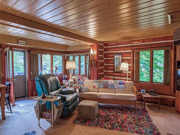 Quintessential northern Michigan riverside log cabin in an idyllic setting on 119' of the Sturgeon River. Notable features of this quaint bungalow include an open living area with wood-burning stone fireplace, spacious master, enchanting updated galley kitchen with custom cherry cabinets, bath with radiant floor and shower heat, and the "fish house" guest quarters with private bedroom and bath. Paramount to this enticing abode is the attractively designed landscaping and vast outdoor living space including two decks, new sea wall and stairs, fencing, 16' dock and underground sprinkler fed from the river. Other noteworthy elements are a new roof in 2019, added insulation, new chinking, and storage building with workshop. This rare offering is nestled on a small private cul-de-sac, yet nearby shopping and dining, snowmobile trails, hunting, bicycle trails, inland water way, and just a short drive from I-75. It is indeed a real charmer!