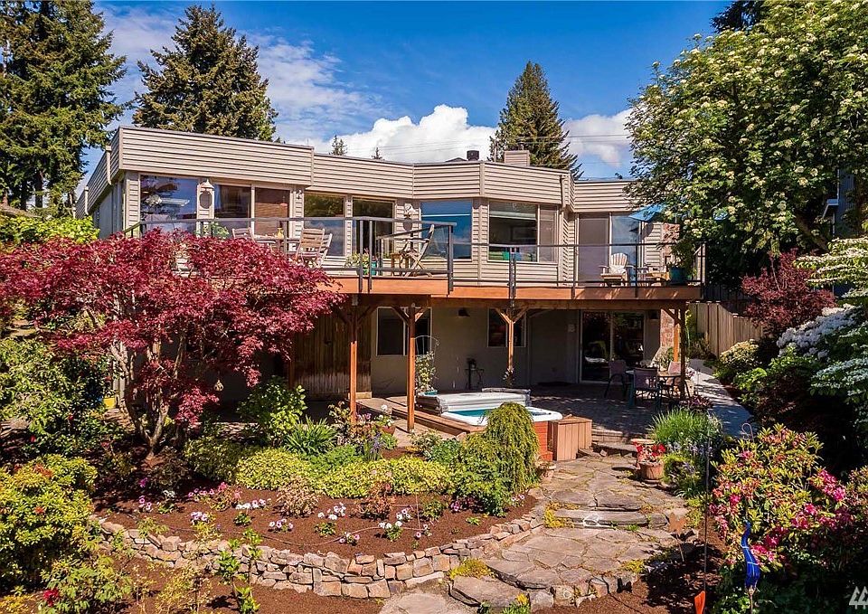 Immaculate contemporary with sound & mtn view from many rooms & the deck of this bright, flowing home. Large cooks kitchen with Wolf stove, granite counters, breakfast bar, open to familyroom. Master is a joy w/slider to the view deck, walk-in closet, skylit 5 piece bath w/soaking tub. All you need for single level living plus spacious lower level w/2 bedrooms, 3/4 bath, office, large recroom w/wet bar, slider to huge patio, hot tub, gorgeous yard w/greenhouse, waterfall & pond. Storage galore.
