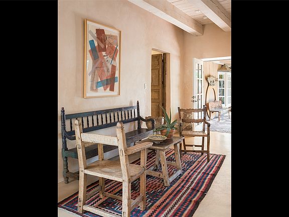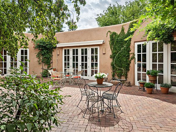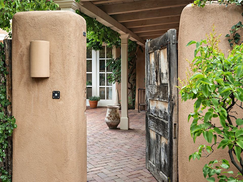 Home of the noted collector and beloved Santa Fe icon , the late Omer Claiborne- this lovely compound is tucked down a quiet lane off Canyon Road. The original home and guest house were built by Agnes Sims in 1947- 1948 . Omer designed the elegant main house in 1997 , attaching it to the original structure . This single level home has a clean , modernist aesthetic and features many architectural details , including lighted , recessed shelves for his museum quality artifacts , multiple fireplaces , concrete floors , French doors throughout , and 12’ beamed ceilings. The 2 bedroom main house opens to a gracious entry courtyard, and flows seamlessly into the original house. The original adobe building is currently used as a gallery but can easily be converted into 2 bedrooms with an existing bath and a sitting area. The detached guest house is accessed through a brick courtyard , and offers privacy and charm. The established landscaping ,coveted location and flexible spaces add to the magic of this special property.