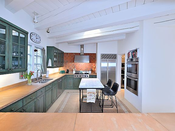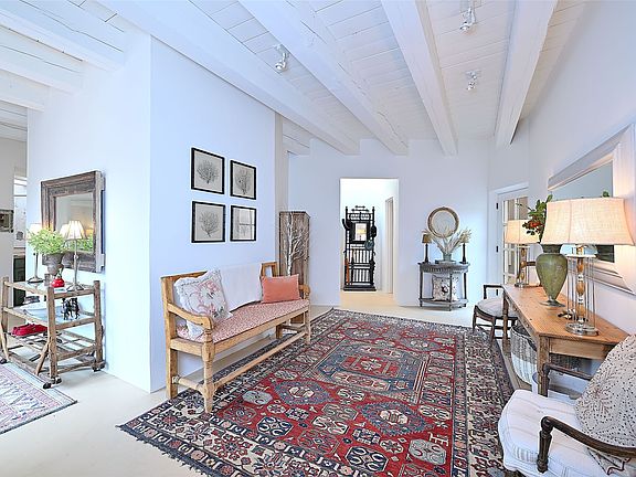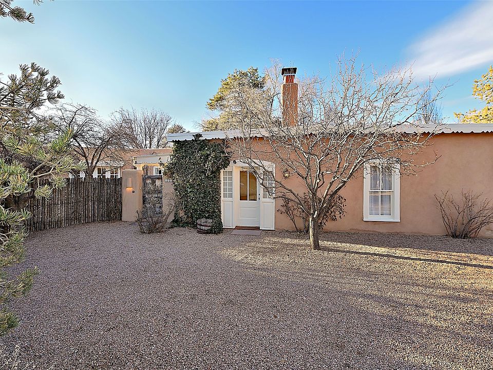 Tucked away on a quiet lane just off historic Canyon Road, this exceptional compound offers Santa Fe living at its best. This house was originally built in 1947 by artist Agnes Simms and thoughtfully expanded in 1997 by noted collector Omer Claiborne. The spacious main house welcomes you with a graceful, light filled living room featuring 12-foot beamed ceilings, multiple French doors, concrete floors, a fireplace, and extensive wall space ideal for displaying artwork. The beautifully designed kitchen opens seamlessly to an impressive dining room and includes a large walk-in pantry. There are four well separated bedrooms and five baths, and the home provides exceptional privacy and comfort. A serene east-facing courtyard extends the living space outdoors, creating a perfect setting for relaxing and dining. Mature plantings – including wisteria, lilacs, pear, plum and crabapple trees enhance the sense of tranquility. The charming guesthouse is accessed through its own courtyard and offers a cozy retreat complete with kiva fireplace, kitchenette, and bath. Located moments from Canyon Road’s renowned galleries and restaurants and within walking distance of the historic Plaza. This rare property represents the best of Santa Fe living.