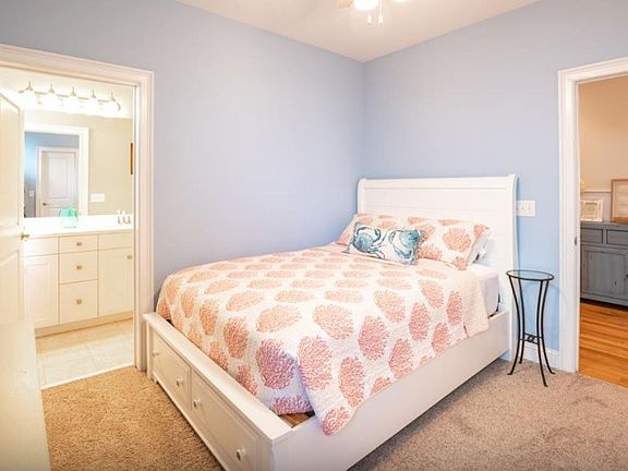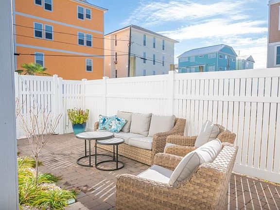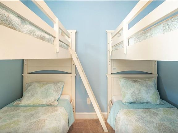 SHORT TERM RENTALS ONLY: Send us your desired dates of stay- availability is subject to change. Wood Vista offers the best of Carolina Beach Rentals Accepts 30 days Stays Off Season. 3 Bedrooms / 3.5 Bathrooms / Sleeps 8 This is the perfect property for two couples and a bunch of kids! You'll love the salt sea air and the gorgeous views from our Two Ocean View Porches, and the short half-block to either the Ocean or Carolina Lake from our gracious home. Two beach access points within a one minute walk make you intimate with the Beach. Pickup your daily fresh foods at Veggie Wagon right behind the house. You'll fall in love with the stunning water views from almost every room and the ease of the elevator at Wood Vista in the heart of Carolina Beach. You'll have plenty of sleep time privacy for three families in our three separate Guest Suites on the first floor of our Townhome. When you are ready to party, have a cocktail on the porch, and fix a delicous meal, join together on the top floor in our beautiful Great Room with shiplap design details and consumate comfort throughout. You'll be surrounded by tons of space and natural light while you revel in your social times as a group, but also have plenty of space to curl up with a good book for some alone time. For a bit of luxurious privacy, greet the sunrise from your private master bedroom porch with your morning coffee and a cool breakfast al fresco. Sophisticated and high quality furnishings will keep you coming back for a casually elegant, yet completely comfortable experience at beautiful Carolina Beach. Ground Level: Assigned covered parking for 4-6 vehicles, size dependent. Plenty of room for golf carts! Shared outdoor patio conversation area with All Weather Rattan & cocktail tables. Elevator to Level 3 with elevator service to Level 4 as well. Property Level: This is a Two Story, Third Floor Townhome. Bedroom Level: Primary Bedroom Suite: King Bed with Storage Drawers, Double Nightstands, Home Office Area, Ceiling fan, TV, Private Porch, En suite bathroom Ensuite Porch: Ocean View, All Weather Seating Vignette, All Weather Pub Table and Stools Ensuite Bath: Corner Garden Tub, Tile Shower, Double vanity, Ocean views, Toilet Guest Suite 1: Queen Bed with Storage Drawers, Chest of Drawers, Ceiling fan, TV, En suite bathroom Guest Bath: Double Vanity, Full Size Walk-In Tile Shower, Toilet Guest Suite 2: Two twin bunk beds (4 total beds), Credenza with TV, Ceiling Fan, En suite bathroom Guest Bath: Bathtub with Shower, Single Vanity, Toilet Stairs or Elevator up to Great Room on top floor Top Floor: Elevator Lobby Kitchen: Full kitchen, Upgraded Stainless steel appliances, Granite countertops, Bartop with seating for 4, Walk-in Pantry Half Bathroom in Hallway: Pedestal Sink, Linen Press, Toilet Dining Area: Solid Wood Dining Table with cushioned seating for 6, Bakers Rack, Ceiling fan Living Room: Fabric Sofa and Loveseat, Supplemental Leather Sofa, , Coffee table, Credenza with Smart TV, Ceiling fan Living Room Porch: Covered, Adirondack Seating for 4, Ocean Views Laundry Room: High Capacity Washer and Dryer, Extra Storage Parking: Two bays fitting 4-6 vehicles designated below the unit.
