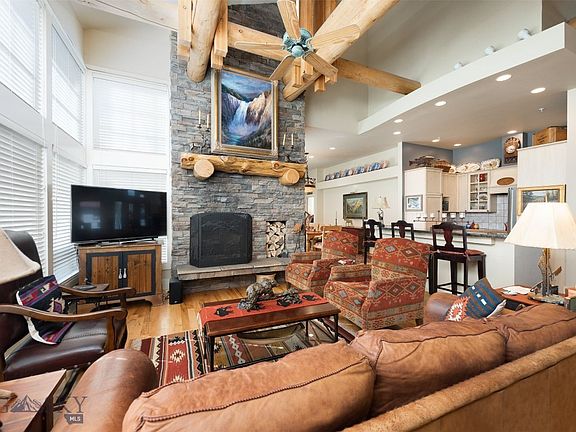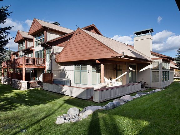 Join the Club at Big Sky favorite meadow condominiums-Crail Creek Club. Fabulous layout offers privacy with main level master bedroom, an upstairs loft and bedroom suite and a downstairs bonus/media room. Soaring ceilings are highlighted by picturesque windows, two distinctive chandeliers, log beams and a stacked floor to ceiling wood fireplace. Open kitchen features an induction cooktop, range, French door refrigerator and plenty of cabinet space. Retreat into the master suite with spa-like bathroom offering dual vanities, a soaker tub and shower. Full laundry room connects with the master bath and walk-in closet. Upgrades abound-hardwood and tile flooring flow throughout; wet bar w/ wine cooler for entertaining. Covered deck with hot tub is protected by large trees and backs to a quiet street. Ideal location to enjoy Big Sky Meadow and Town Center restaurants, amenities, Farmer's Market and Summer concerts. Crail Creek's campus is adjacent to the 10th hole on Big Sky's golf course.