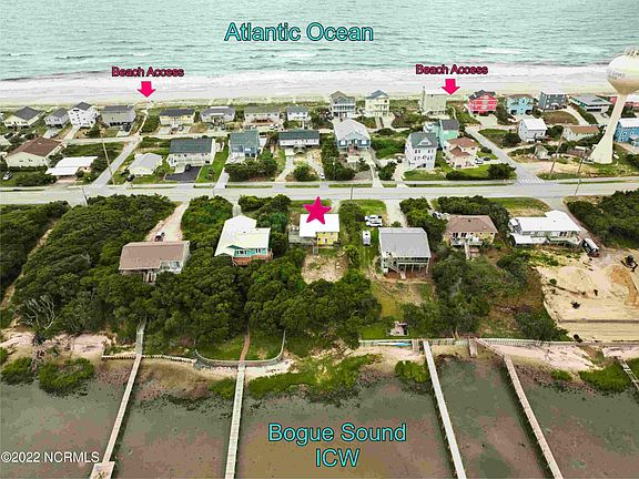 5 bedroom, 3 bath Soundfront in Emerald Isle. This Classic Mid-Century Cottage is ready to shine! This waterfront property has so much potential. Features include vaulted original tongue and groove beam ceilings throughout the top floor, open floor plan with two living areas and 2 master suites. High vegetated lot. Beautiful soundviews and 3rd row from the ocean/beach access. Great primary, 2nd or investment property. New metal roof in 2018. Not located in a flood zone. Property is being Sold As-Is. Furnished with few exceptions. Call today to schedule your appointment!