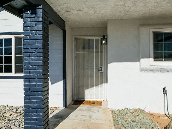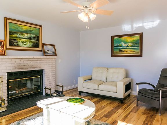 BEAUTIFUL CANDY CANE LANE HOME in a charming neighborhood. Freshly painted exterior. Large river rock xeriscaped front yard. Inside, a cozy living room with a wood fireplace and large picture window. Knotty pine look laminate flooring extends throughout the living room, bedrooms, and hallway. Kitchen is a chef's dream: Corian counters, integrated ceramic sink, stainless steel appliances, gas oven, blond oak cabinets, and ceramic tile floor. Dining area just off the kitchen. Bonus family room flows from the dining area and has a sliding door that leads to the rear patio. Master bedroom with double closets and ceiling fan. Master bathroom features a sliding barn door, Formica counter, single sink, and shower insert. Two other bedrooms have ceiling fans and ample closet space. Hall bathroom is spacious and includes a Formica counter and tub/shower. AeroCool unit for added summer comfort. Backyard paradise with an east-facing patio, eucalyptus tree, green grass, gravel, and newer fences. There's a private BBQ area with a pergola. Plenty of driveway space for RV parking. Washer and dryer stay with the home. Home and roof inspections are complete for buyer peace of mind.
