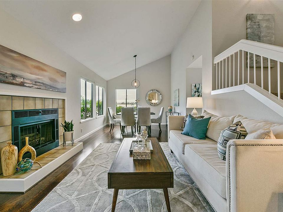 Step into this spacious and stunning 2bd/2ba townhome and experience the calming atmosphere and water views. With beautiful new floors in the living/dining area the entrance of the home offers open concept with views of SF & Alameda Island; enjoy the summer breeze or cozy up next to the wood burning fireplace. The kitchen features newly installed quartz countertops, freshly painted cabinets with enough room for an eat-in table, flow from the kitchen to the enclosed back patio. The second floor offers a spacious master bedroom and a large second bedroom and a full bathroom. Built in 1984 with a new wood shingled roof installed last year over the entire home including the two-car garage which also houses the washer/dryer. Truly a great location to soak in the views and serenity of the Seaview Parkway trails and the Shoreline Park. Easy commute to SF. The Bay Farm ferry terminal is a short drive or the OX Transbay bus will pick you up nearby. Highly rated Bay Farm K-8 School is close by!