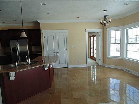 Stunning all Brick with stone entry 3 bed ranch home. Large Kit with Granite,Bosch SS Appl. with Nook with a walk-out to a 43 ft private deck.9ft cathedral ceilings,hardwood flrs,with plenty of recessed lighting. Stone gas vented fireplace in livingroom,masterbath with whirlpool tub plus walk-in shower connected to a walk-in closet. Huge finished family room with full bath.ICF foundation walls,2 tankless hot water,3 car garage with attic for plenty of storage and a stamped concrete driveway and sidewalk.