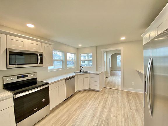 Beautiful inside and out! Completely remodeled 3 bedroom 1 bath home with main floor laundry and off street parking. All new: Pella windows, siding, gutters, electrical, plumbing, sprayed Perma Seal cellulose insulation (R-24 walls R-40 attic), drywall and fresh neutral paint. Solid wood white doors, white trim and durable Pergo Portfolio Crema Oak wood plank floors. Kitchen is bright with white shaker style custom cabinetry, 2 large pantry cabinets, white marble laminate countertops, deep SS sink, bronze Delta sink fixture, SS Whirlpool appliances and breakfast bar. Nice backyard with 12x13 concrete patio. New gas water heater and new roof in 2017. Covered front porch and cute entry. Curved doorways into LR and exposed brick add character. Great location near shopping, dining, schools, parks and library. Move right in!