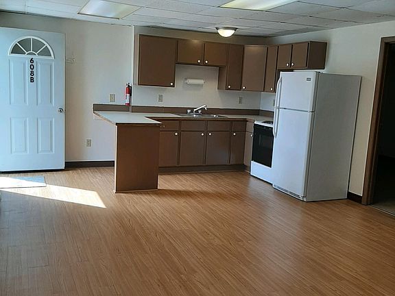 This 2-bdrm apartment is all on the first floor. New carpets in both bedrooms and new vinyl wood flooring in the kitchen and living room. Easy walk to downtown and groceries. Owner provides trash and off street parking. Owner pays water, sewage, garbage service. Tenant only pays electric. Unit has electric heat.