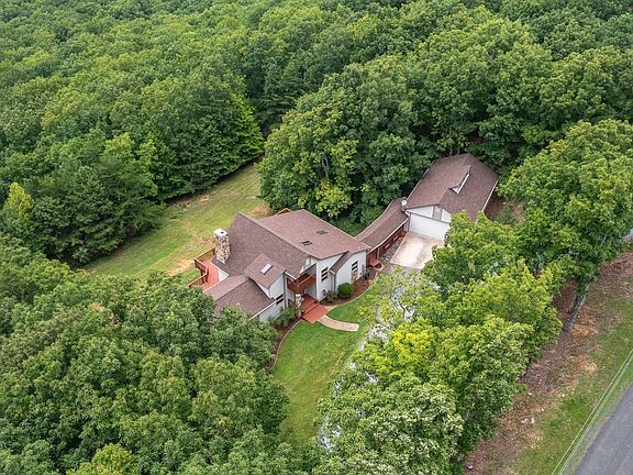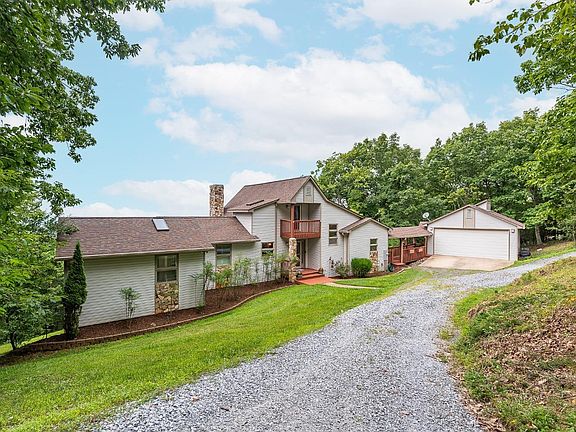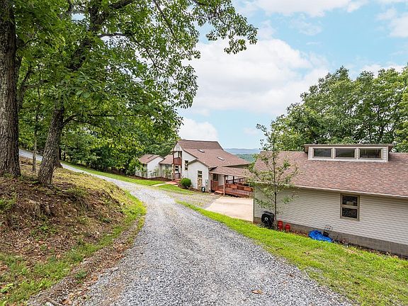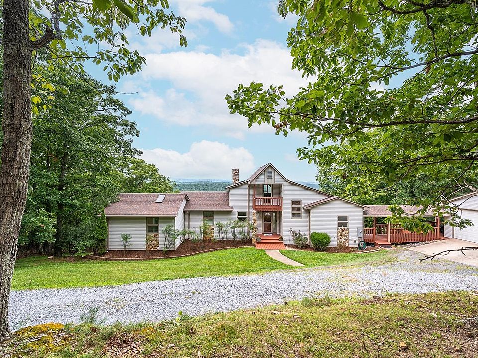 Pristine, mountaintop sanctuary crafted to integrate the outdoors with the indoors. The sweeping vistas are indescribable in photos, showcasing vast skies, mountains, & forests as far as the eye can see. The open layout w/ hardwood floors, large windows, skylights, glass doors, cathedral ceilings in the great room with tongue-n-groove detailing, & a large rock fireplace for that cabin feel. Updated kitchen with SS appliances, granite counters, pantry & open to the dining area. Main-level primary with large ensuite including double vanity, garden tub, shower, large his-&-hers closet. A mudroom & main level laundry area adjacent to the breezeway entrance. The terrace level includes a family room w/ access to the lower deck, two bedrooms, a full bathroom & an unfinished area under primary with many possibilities. Expansive deck encircles the home, connecting to the breezeway & oversized garage w/ electric & water that's perfect for a workshop. Wired for hot tub, 20 min to LU.