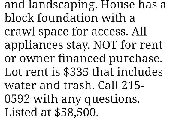 This double wide manufactured home features 3 bedrooms with 2 full baths. The open kitchen provides abundance of cabinet space, breakfast bar and eat-in dining area. Nice sized living room features picture windows and plenty of room for relaxing. Master bedroom has a walk through bath with double sinks. House and garage both face South and has 3 stalls with plenty of storage. Located on a double corner lot with mature trees and landscaping. House has a block foundation with a crawl space for access. Call Ryan for more information, 605-215-0592