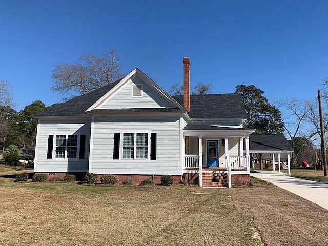 Don't let the age of this home fool you. It has been extensively renovated and modernized with new plumbing, electrical, roof, A/C, exterior siding, windows, and interior finishes and floorplan changes. The seller has kept the character of the home with beautiful antique doors, soaring ceilings, and kitchen fireplace with built-ins while incorporating new features and an open floorplan. This home is beautiful and functional with a spacious den; kitchen with custom cabinets, granite countertops, island with storage, large pantry; dining area that opens onto the covered back porch; master suite with luxury bathroom that features a walk-in closet, tiled shower, double vanity with granite countertops; large guest bedrooms with great closet storage; updated guest bathroom with tub/shower combo. There is also a detached 2-car carport with breezeway to the house. Own a piece of history that has been lovingly restored and is situated on a pretty corner lot in town.