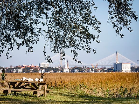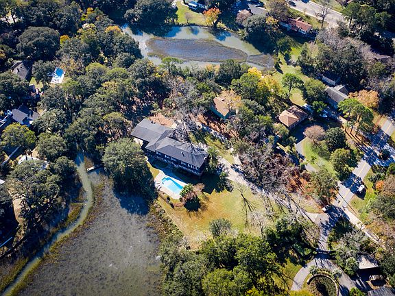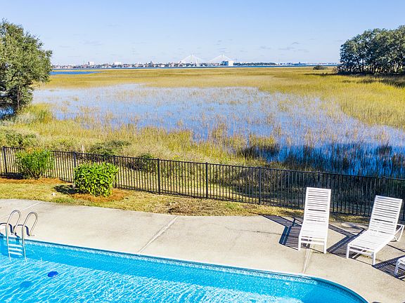 ''Experience an absolutely stunning ''Picture Postcard'' view of the Holy City from nearly every room in the house! The property is on a tidal creek, complete with a dock and boat launching area. Stand in the huge 1.82 Acre yard, next to the pool, and let your eyes gaze out across the marshes to the panoramic view of Charleston Harbor and the city beyond. From here, you can see the Battery, White Point Garden, the Yorktown, and up toward the gorgeous shining diamonds of the Ravenel Bridge. On a sunny day, the church steeples shine against the blue of the Carolina sky. Such a view is an incredibly rare find, and becomes even more spectacular when you factor in regular firework displays over the city, the brisk port traffic of container and cruise ships daily, as well as the lively,