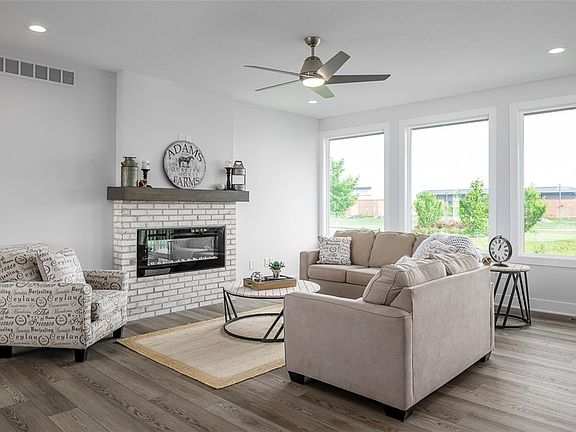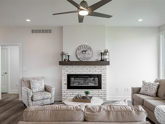 Tanzanite Homes custom Crystal ranch home in HERITAGE AT GRIMES! This unique and modern split bedroom ranch has 4 bedrooms and 3 bath areas. Main floor great room with fireplace, open to kitchen and dining area. The kitchen features Quartz countertops, stainless steel appliances, soft close cabinets with crown molding, and a large pantry. Great drop zone with built-in lockers. Main floor laundry with access to primary closet. Primary suite with huge walk-in closet, large windows, bath with double vanities, and walk-in tiled shower. Hardiplank siding gives this home great curb appeal. The finished LL has a 4th bedroom, 3rd bath, huge family room, great wet bar, and unfinished area for storage. The home also features a covered deck. passive radon mitigation system, irrigation, 3 car attached garage, key pad and fully sodded. No closing cost or origination fee through preferred lender. This home is complete and move in ready!