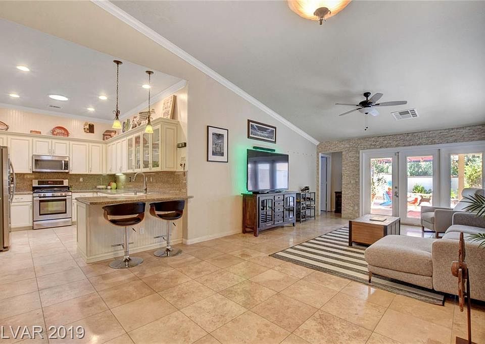 Charming single story home inside the gated Sunset Mesa community; situated near Summerlin Hospital, Red Rock, Downtown Summerlin & Freeway. Vaulted ceilings, crown molding, plantation shutters, new spa-esque bathroom w/ frameless steam shower, built-in bluetooth speaker. Spacious backyard with covered patio, wood fireplace surrounded by mature landscaping, providing the ultimate outdoor space to unwind and enjoy the summer nights.