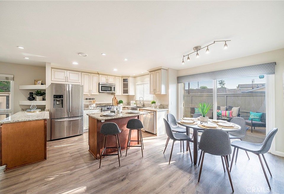 It’s all about the location, and this remodeled 3 bedroom, 2.5 bath end unit townhouse in Brookview Complex has it! The light and bright open floor plan of the townhouse, with direct garage access, is perfect! The unit has gorgeous laminate hardwood floors downstairs with the 3 bedrooms having carpet upstairs (just installed and brand new). The newer remodeled large kitchen has granite counters with island (great for a breakfast bar) and features lots of custom cabinet space with stainless steel appliances. It opens up to the living room as well as the dining area creating an open spacious and functional space. The fireplace in the living room is so cozy and from the living room you have French doors that lead to a private patio with wood deck and side yard. The 3 bedrooms are a very spacious size and the master suite has an extra large bathroom with walk-in shower and plenty of closet space. It features a large wraparound patio that goes to the 2nd bedroom. The unit has a washer and dryer in a separate room. The 2.5 bathrooms are remodeled with granite counter tops. The amenities of the complex include pool, spa, tennis, and a clubhouse. The location is amazing: close to freeway access, South Coast Plaza, and many restaurants. Only a 15 minute drive to beautiful Newport Beach. This is a FHA approved building and A+ School district.