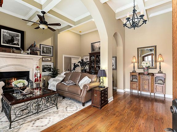 Welcome to this nearly 3,400 square foot single story home that offers you a spacious elegant design and is located at the beautiful Five Oaks Development complete with golf course, pool, clubhouse and tennis courts. High coffered ceilings, open concept, arched doorways, and hardwood flooring create an immediate sense of grandeur upon entry. The formal living room open to the formal dining room features a grand fireplace, while the gourmet kitchen, complete with an island, double ovens, and a walk-in pantry, opens seamlessly into the family room, which also includes a fireplace. The split bedroom plan provides privacy, with the primary suite showcasing a sitting area, triple trey ceilings and an exceptionally large walk-in custom closet that is as big as a bedroom! Primary private bath suite features dual sinks, a sit-down vanity area, soaking tub and walk in tiled shower. Both guest bedrooms are generously sized and include a connecting full bathroom.