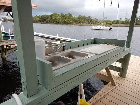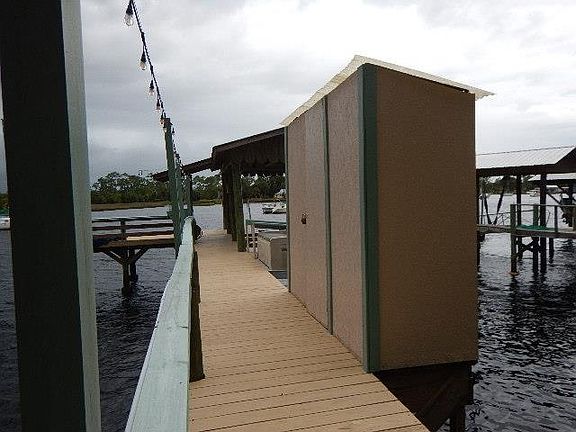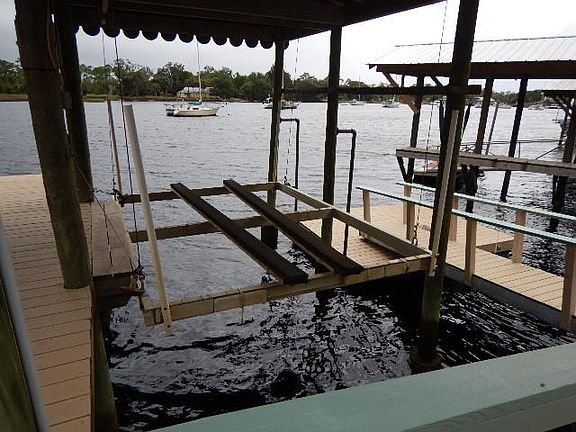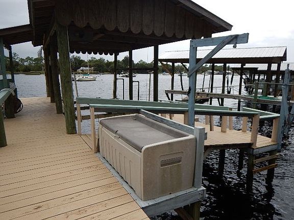 Tired of marina fees? Here's a great place to dock your boat in some of the deepest water in the river. Covered slip with lift to hold 21 ft boat, floating dock on the side, deck for sunning or just sitting in the evening to watch the boats go by or watch those gorgeous Steinhatchee sunsets. Includes storage shed and deck box for your boating gear, fish cleaning sink. Has running water and power.