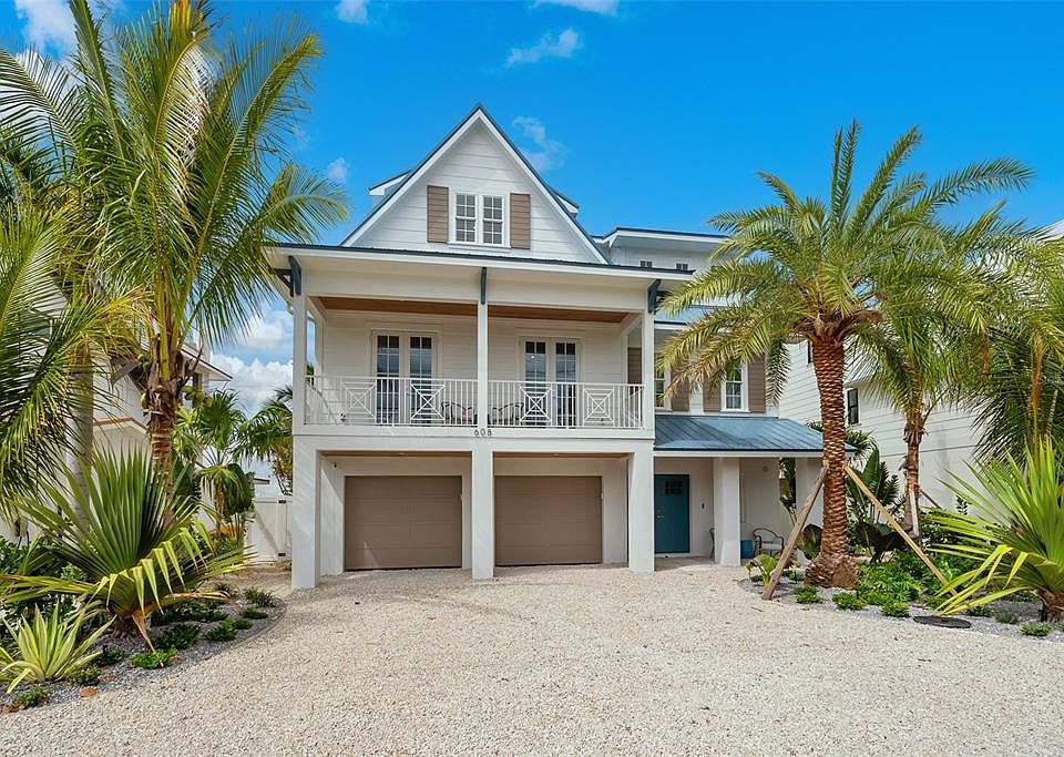 Brand New Custom Bayfront house in the North End of Anna Maria built on an oversized 60’ wide lot with panoramic breathtaking open-water bay-views of the Skyway Bridge. And, unlike Gulf front homes, the sandy beach in front of this home is private! Only a few short blocks to the shops and restaurants on Pine Avenue, this professionally decorated island home features a large open-plan living area (living, dining, kitchen, bar), 4 bedrooms each with an ensuite bathroom, an office, a half-bath, a separate living/sitting room on the top floor and extensive balconies overlooking the bay. This waterfront retreat is built to the highest standards and offers impeccable finishes throughout, including elevator to all floors, extensive trim-work throughout, solar panels, gourmet kitchen, and deep pilings. The gourmet kitchen showcases custom cabinetry, quartz counter tops, gas range, and high end appliances (Wolf, Subzero, Bosch). Built to minimize on-going costs thanks to roof-top solar panels, two efficient Daikin AC units, multi-panel impact-resistant windows and sliders, Florida-friendly irrigated landscaping, tankless water heater, and extensive insulation throughout. Technology features include multi-level Wifi hotspots, zoned Sonos sound system, Ring doorbell, security camera system and an in-wall iPad control station, thereby allowing you to remotely control your cameras, sounds system, doorbell, garage doors and thermostats using any smart phone/device. On the ground floor, you'll enjoy your very own tropical paradise featuring an indoor bar and game room area which leads outside to your large heated pool/spa, lush landscaping and miniature golf course, all overlooking the beautiful waters of Tampa Bay and your private sandy beach. The master suite has its own private balcony with nothing but water views and includes his and her walk-in-closets and a huge bathroom with a walk-in shower and stand-alone soak-in tub. Don’t forget you can launch your kayak or paddle boards and toss a line and fish right in the bay waters, or simply relax by the pool listening to the waves!