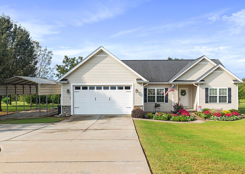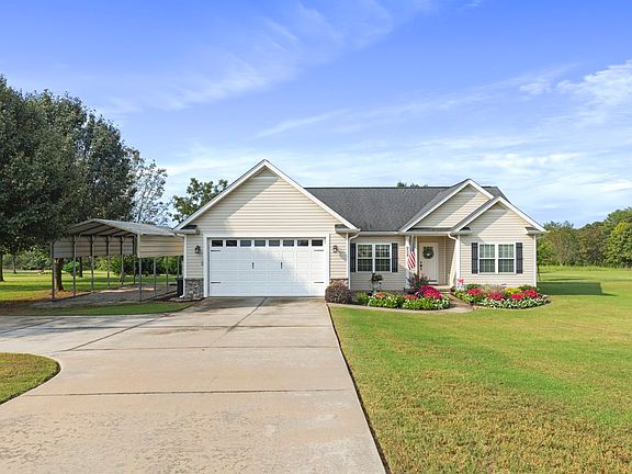 Gorgeous 3 bed 2 bath home on 1.16 acre of level usable land. This 2014 home has been meticulously kept from the gardens outside to the hardwood flooring inside. Lots of storage space awaits you in this 1667 square foot home, including the two car garage with shelving, the 10x16 storage shed with lean to, and the fixed carport that's perfect for your camper or extra vehicle. Blooming flowers, Pecan trees, and a prepared 30x40 garden are already in place for you. If this isn't enough, there's more land in the back for all your other hobbies and interests. Inside the split floor plan, you'll find 9' ceilings throughout, along with the vaulted living room. The Oak hardwood flooring is finished nicely and compliments the living areas perfectly. Granite countertops in the kitchen and bathrooms complete the high end finishes. The laundry room has a convenient sink, lots of cabinets for storage and comes with washer and dryer. The primary bedroom is a spacious one and the connecting bath has it all! This consists of a two sink vanity, a walk-in shower, a soaking tub, and a closet that will hold all your clothes plus the ones you still want to shop for!! We didn't even mention the breakfast area, the covered back porch, or the living room with a gas log fireplace. So to all you folk, I do invoke, to see Tall Oak, she ain't no joke!