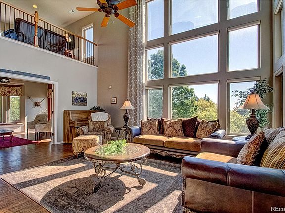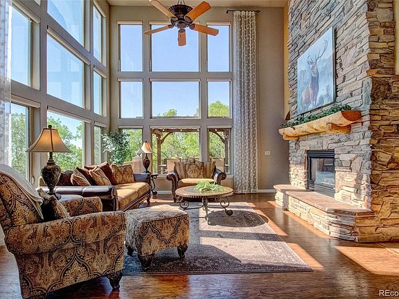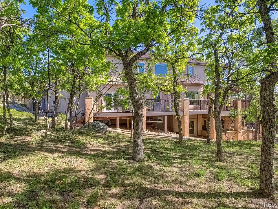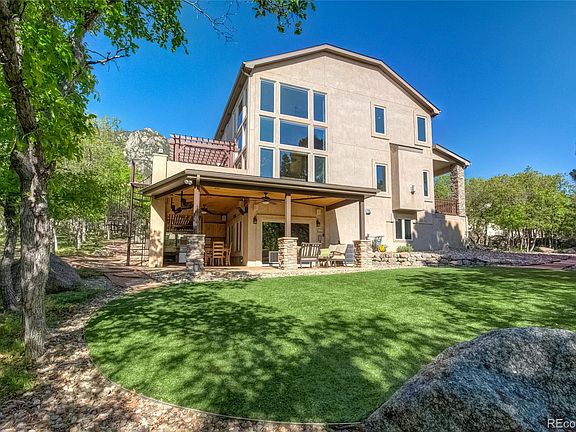 Stunning custom home on .59 acres in award-winning D-12 schools, nestled against Cheyenne Mtn with incredible outdoor living space, privacy, and peak views! A magnificent great room with soaring cathedral ceilings, 2-story walls of windows with sweeping views, an exquisite floor-to-ceiling stacked stone fireplace, gourmet kitchen with cherry cabinetry and slab granite, luxurious master retreat with coffee bar and fireplace, rich hardwoods, walk-out lower level with wet bar and theater room, and premier outdoor living with a tremendous outdoor kitchen, large private composite deck, natural landscaping, and abundant wildlife all showcase this beautiful home. Towering trees welcome you inside to a grand entrance hall and open living and dining areas, and the great room offers soaring ceilings, stone fireplace with log mantle, and walls of windows bringing the outdoor mountain setting in. The gourmet kitchen boasts rich cabinetry, slab granite, double-sided fireplace, double ovens, gas cooktop, and a center island with a counter bar. Two nearby dining areas-one formal with hardwoods, and one informal with bay windows framing views-offer plenty of space for entertaining. Glass doors open to the large composite deck, and an outdoor dining area offers Colorado living at its best. The luxurious master has a double-sided fireplace, coffee bar, panoramic views, and a spa-like bath with a jetted soaking tub and a steam shower. Two additional upper-level bedrooms share a full hall bath, and a loft overlooks the great room below. The walk-out lower level boasts a theater room, wet bar, exercise room or office, and a 5th private bedroom, and an exceptional outdoor kitchen is perfect for summer BBQs. Other home features include a huge upper-level laundry, remote-controlled blinds, double furnaces/hot water heaters, oversized 3-car garage, and an excellent location with abundant wildlife including wild turkey, deer, eagles, and fox. This incredible home is not to be missed!