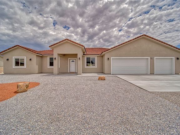 Welcome to this stunning newly constructed home! This spacious property offers four bedrooms and 3 bathrooms, providing comfortable living space for families or individuals. The kitchen and bathrooms are adorned with custom cabinets and quartz countertops, adding a touch of sophistication to your everyday life. With a three-car garage, you'll have plenty of room for your vehicles and additional storage. The RV hookups make it easy to accommodate your recreational vehicles, making this property ideal for outdoor enthusiasts and adventurers. On almost an acre of land, you'll have ample space for outdoor activities, gardening. Plus, mountain views surrounding the property create a picturesque backdrop that you can enjoy from the comfort of your home. The convenient location offers easy access to the highway, making commuting or exploring neighboring areas a breeze. Easy accessibility to Creech Air Force Base or the test site. Don't miss the opportunity to make this dream home yours!