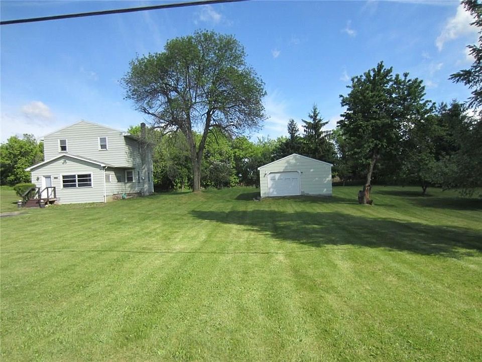 Three bedroom/(1) bath home on spacious one acre lot.All public utilities and close to thruway!One and a half car garage and back patio for entertaining.Newer pet fence installed on the property.New metal roof being installed.Home could easily be a (4) bedroom with minimal renovation.