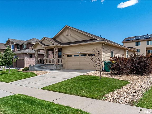 Have you been looking for a ranch style house with fully finished basement? Welcome home to Espana. Great D.R. Horton 2014 built ranch with a nice open floor plan. There is a dedicated office, flex room in basement with full wet bar with dishwasher and wine/drink fridge. A bonus room that could be a play room, school room or exercise/yoga room. Basement has been professionally finished by the builder. All appliances in the home are staying with the home including the washer and dryer. With 4 bedrooms and 3 bathrooms this home is a great place to work, study, relax and yes entertain - great space with extra storage just in case we get quarantined again. Nice neighborhood that is developing and growing. Easy access to shopping, highway and DIA. Just turn the key and say " Honey I'm Home!" Come see it today.